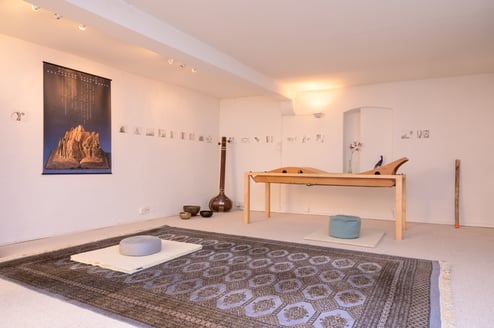 Sie liegen direkt auf einem Resonanzkörper, dessen Unterseite mit 55 gleichgestimmten Saiten bespannt ist. Beim Spielen des Monochords wird Ihr ganzer Körper in Schwingung versetzt, die Vibration erreicht jede einzelne Zelle. Ein Klangfeld aus Grund- und Obertönen durchdringt Sie.
